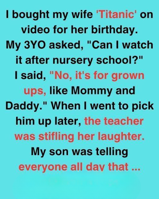 He nodded seriously, making Emily laugh. “Okay,” he said. Later that afternoon, at preschool, he proudly announced to anyone who would listen, “Mommy and Daddy watch Titanic alone at night!”