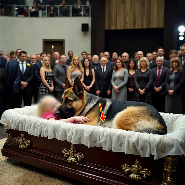 The dog did not slow. She reached the coffin in seconds, leapt onto it, and stood perfectly still, her body tense and alert. She did not bark or growl. She simply stood guard, her ears forward, her gaze sharp and unwavering.