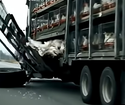 The footage shows the catastrophic failure of the side panel of a large poultry transport truck. In an instant, hundreds of live chickens burst out of the vehicle, tumbling onto the roadway, feathers flying in every direction. Cars swerved, horns blared, and drivers could do nothing but witness the surreal scene unfold.